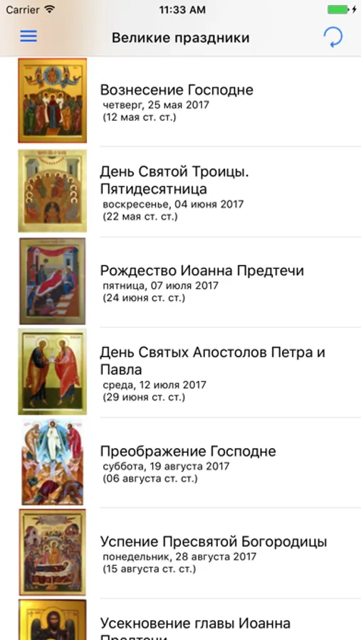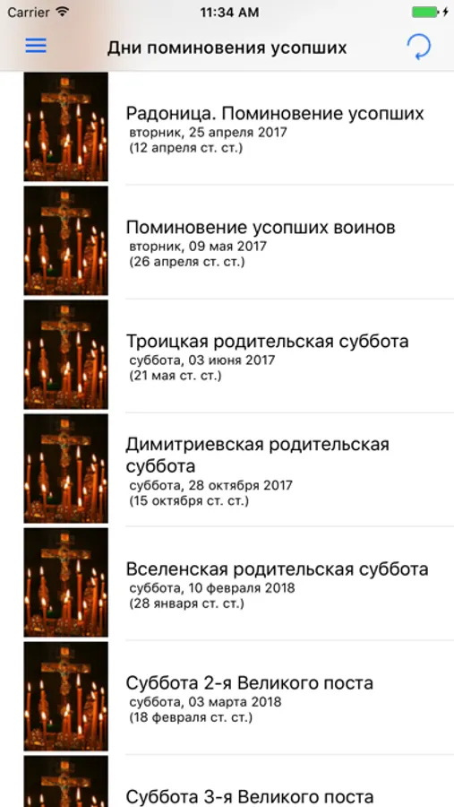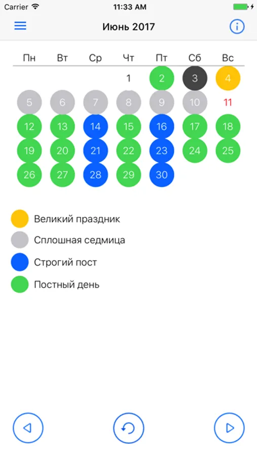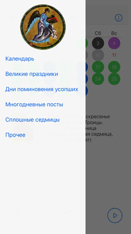 Приложение содержит календарь русской православной церкви. Календарь можно листать месяц за месяцем, и, нажав интересующую дату, увидеть информацию о выбранном дне. Также есть возможность просмотреть отдельными списками Великие праздники, Дни особого поминовения усопших, многодневные посты, сплошные седмицы.