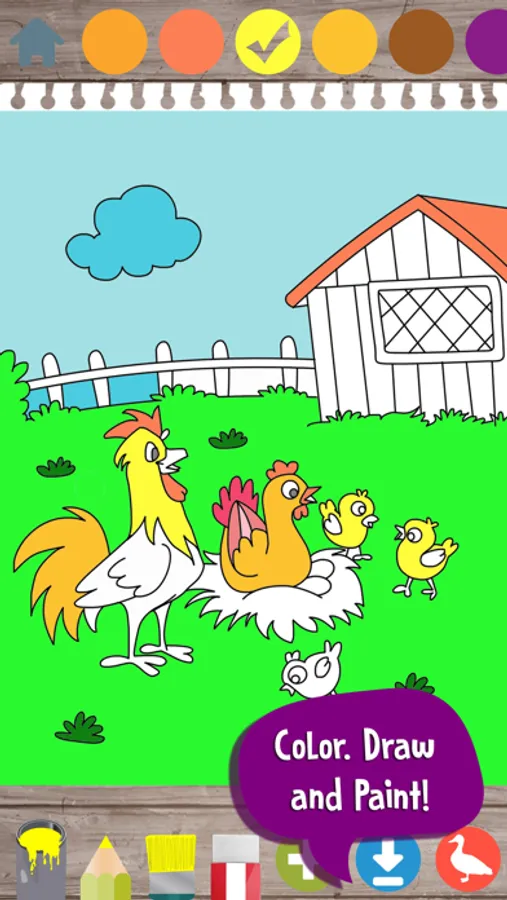 - Drawing Game: Kids will draw on empty canvas or on farm shapes. They can use various colors for drawing and can save their drawings. This section is a doodle for kids.