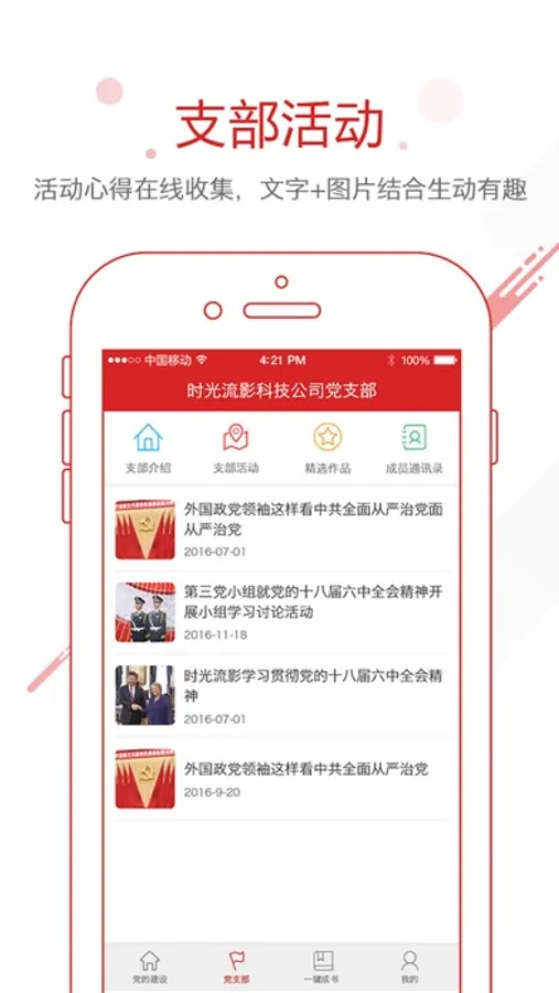 党建工作平台是由安徽出版集团旗下融媒体互联网公司——时光流影科技股份有限公司打造的“指尖上的学习”系统,主要针对企事业单位进行党建学习、活动等方面的管理、汇总、整理。