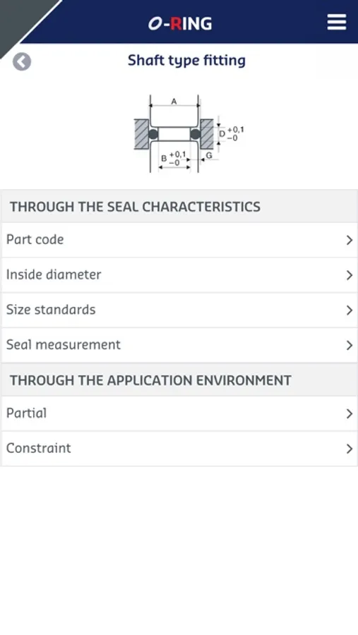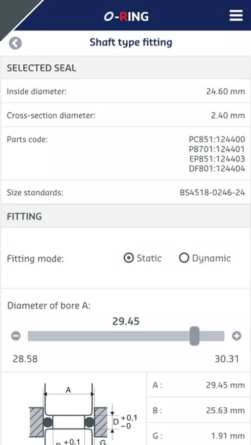 On the contrary, after choosing the installation type and the groove dimensions, the app will recommend a list of compatible O-Ring dimensions.