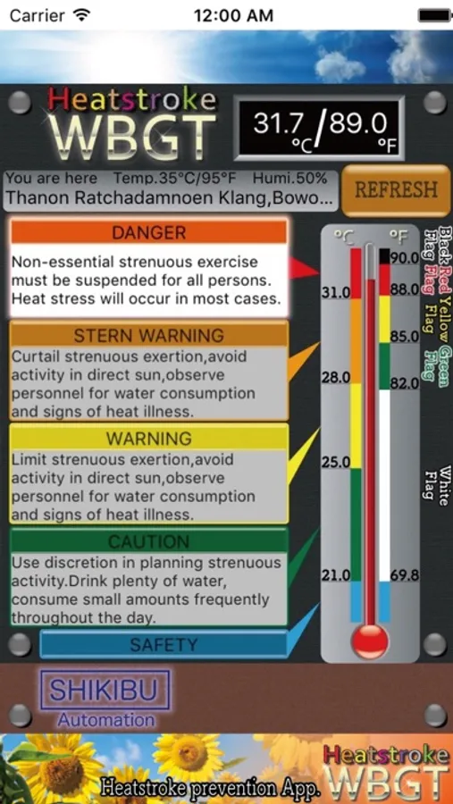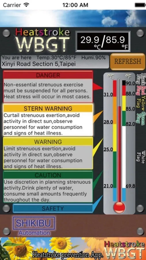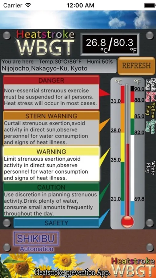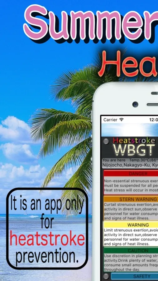 This is app that measures the outdoor WBGT (heatstroke index) in current location, and teaches the heatstroke alert level and the heatstroke countermeasure method to you.