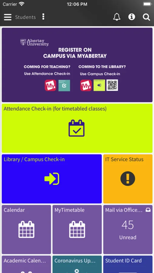 The myAbertay app gives you access to everything you need for your life at the University in one place and with notifications to keep you updated. You can customise the mobile view through the desktop version, to get a more personalised view.