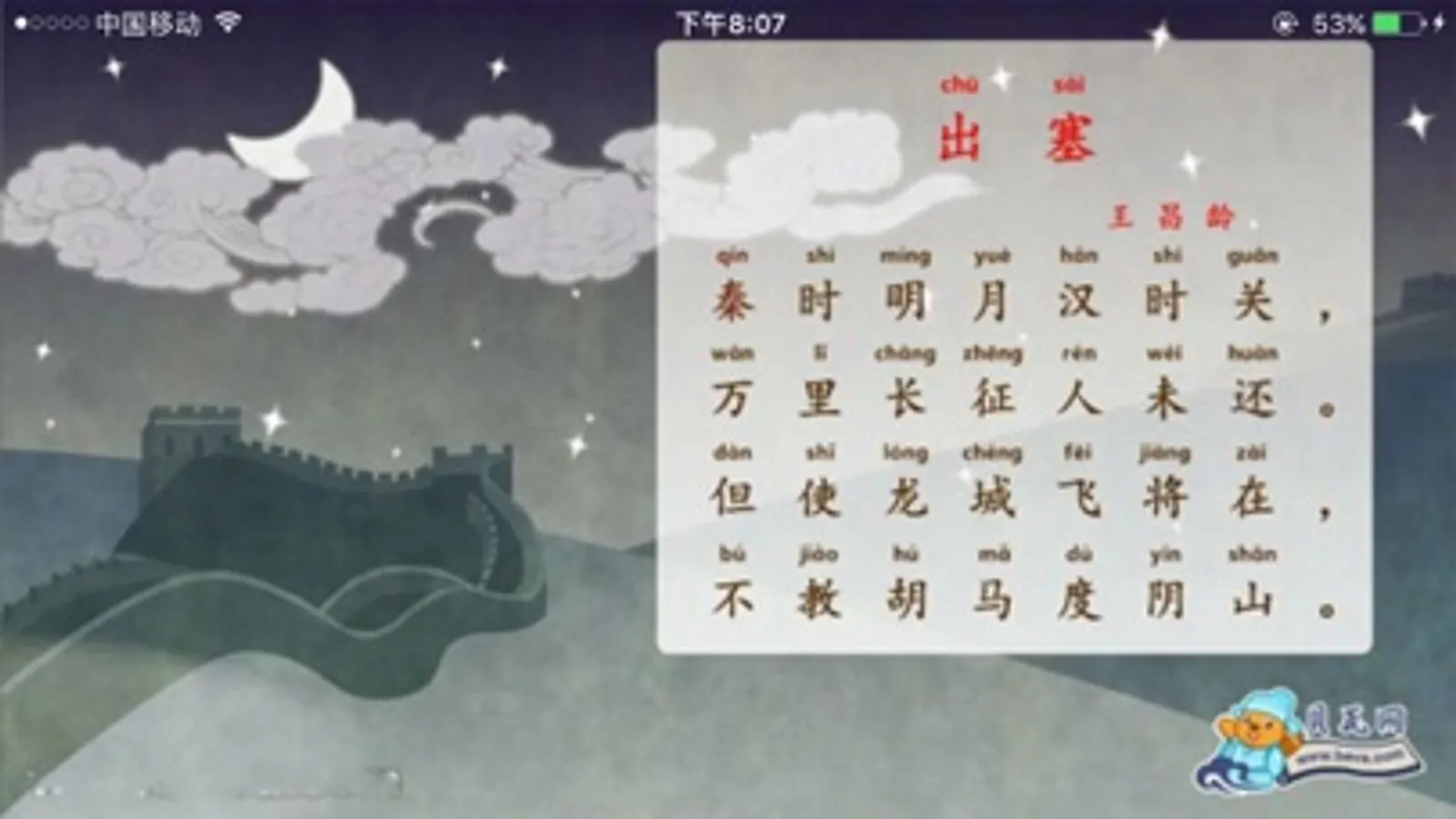 每首唐诗,都有配音引导宝宝跟读,文字加上拼音,更专业。