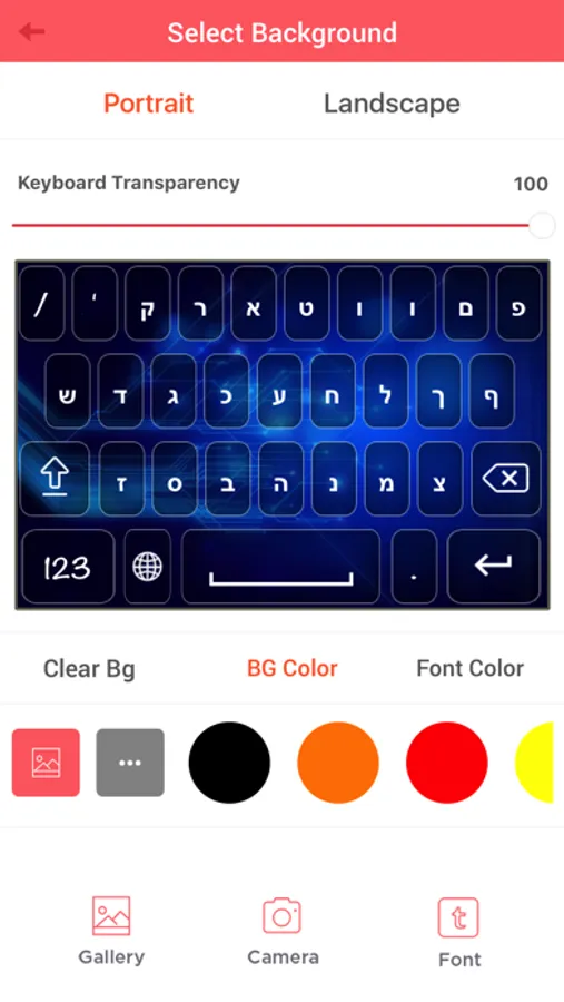 → Customize Theme provides facility of Keyboard Transparency, Background Color, Font Color, Font Apply in Hebrew keyboard.