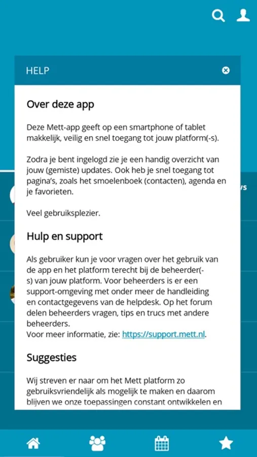 Je hebt een profiel nodig op een Mett platform om deze app te gebruiken. Vul het webadres in van jouw platform en log in met je eigen profiel.