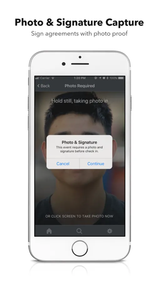 • Finger Signature with Photo Proof: Capture a headshot and collect a finger signature from attendees for waivers and terms.