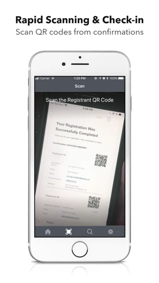 → QR scanning: Scan an attendee’s confirmation page or phone to look up their record and checkin.