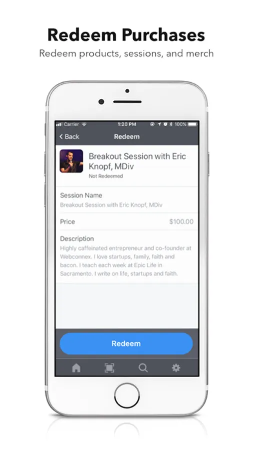 → Redeem Merch and Sessions: Redeem purchases and check-in people into sessions.