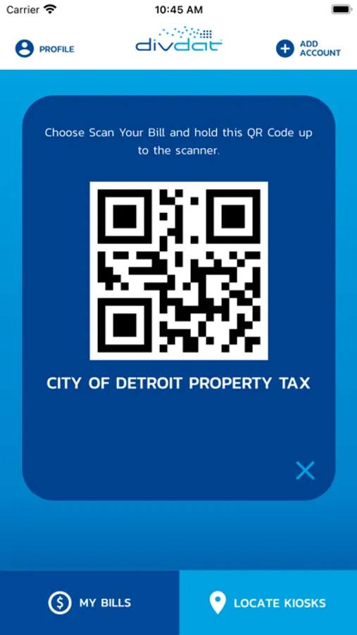 - User-specific scannable QR Code for use in conjunction with the DivDat Bill Payment Kiosks for quick and easy account look-ups