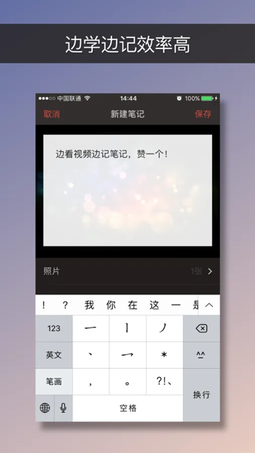 【记笔记】边看视频边记笔记。好记性不如烂笔头。支持拍摄或从系统相册添加照片到笔记。支持笔记排序。支持笔记编辑。