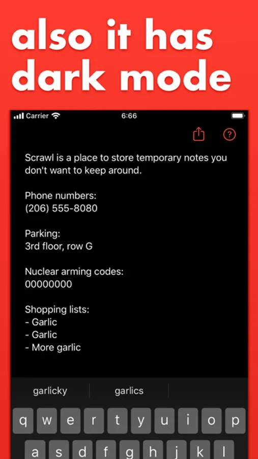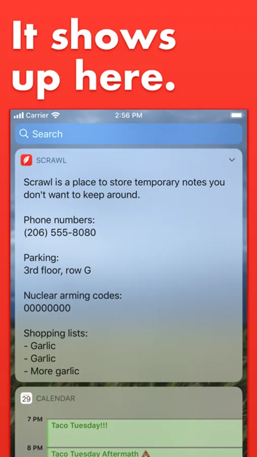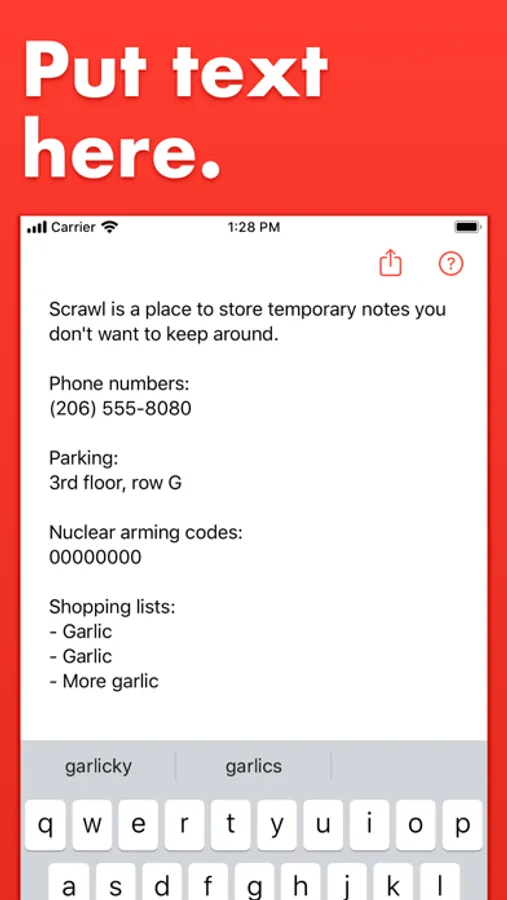 Scrawl is a place to put those little notes you need for just a minute and then never want to see again. Where did you park the car? What's the ten-digit code to disarm the bomb? What gate do you need to meet your mother at?