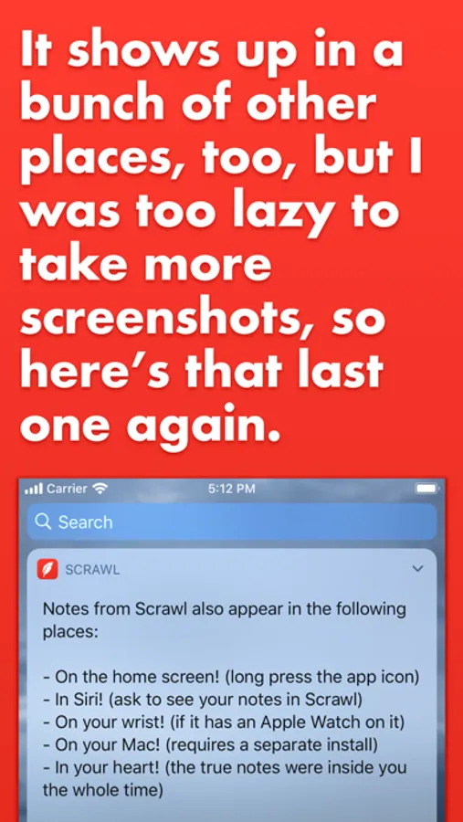 Scrawl isn't a complicated app. It's not even a particularly good app. It's just a place to put some text for a bit, and then look at it later. If that doesn't sell you on it, you probably don't want it. But if it _does_ sell you on it: good news! It's free! I'm not even going to sell your information to pay for it! Act quick to take advantage of this unlimited-time offer!