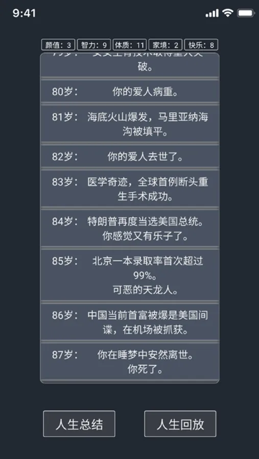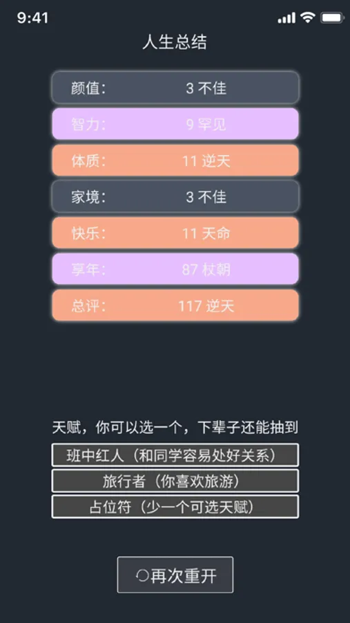 人生重开模拟器是一款能够让你不断轮回模拟人生的手机游戏,从天赋开始选择,模拟一个人的全部生命轨迹,在这个虚拟的世界可以体验到非常奇趣的人生体验玩法,让你能够在这个游戏之中获得一段精彩的人生,各种各样的模拟玩法可以带给你不一样的游戏体验,带来真实的人生重开体验。
