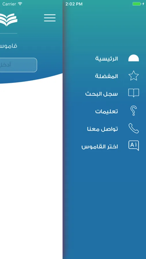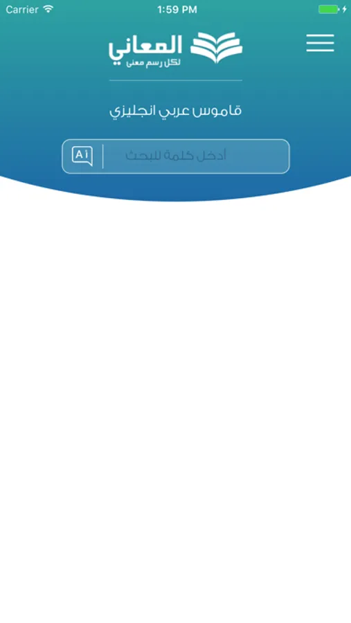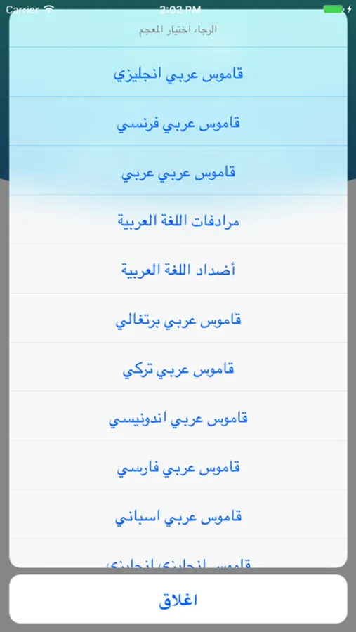 1- في صفحة البحث اختيار المعجم بالنقر مرة واحدة على النص أعلى مربع البحث