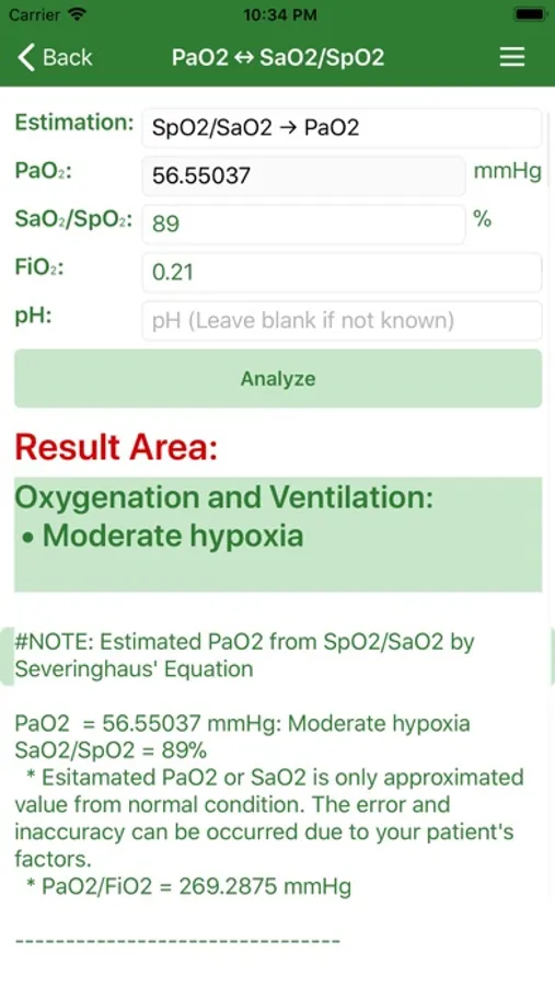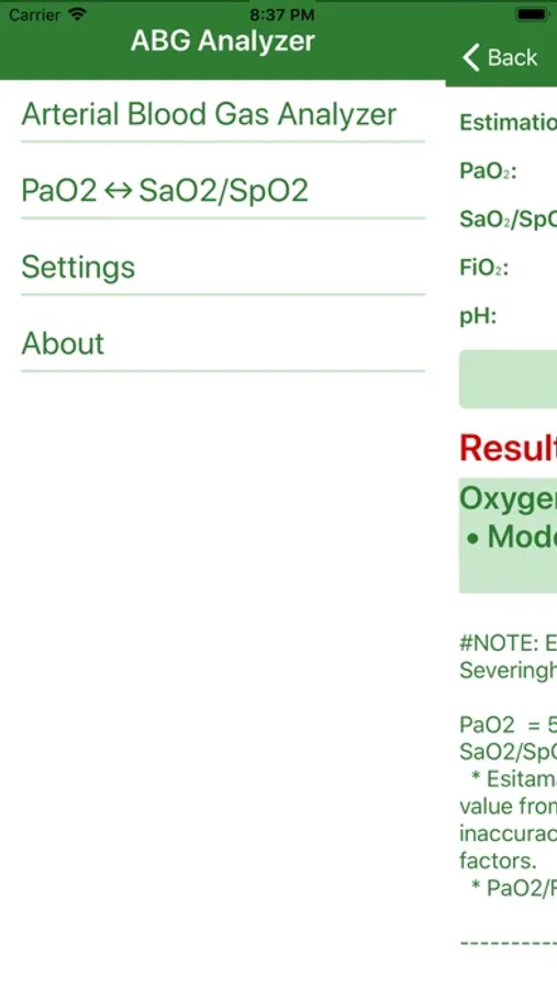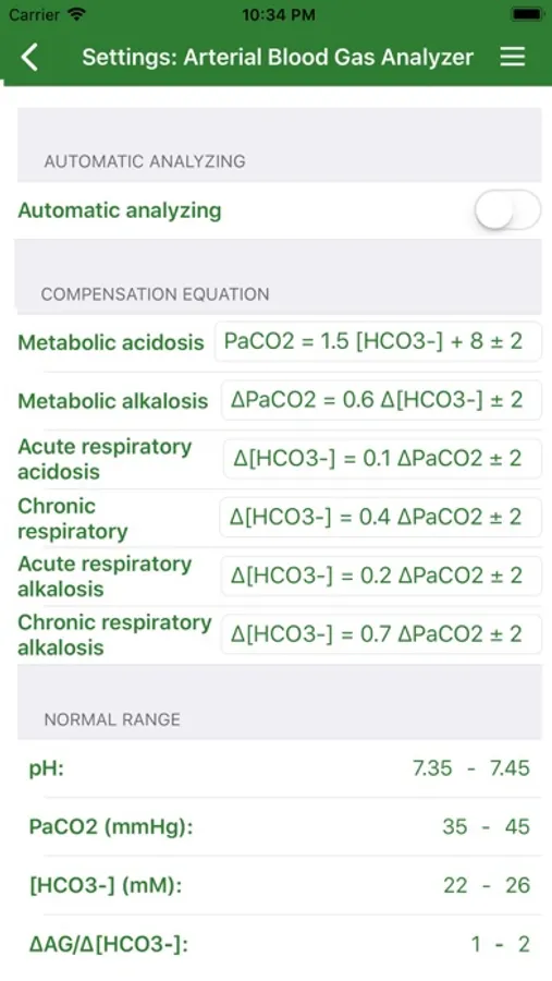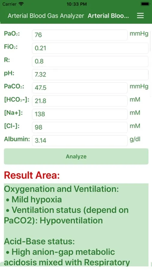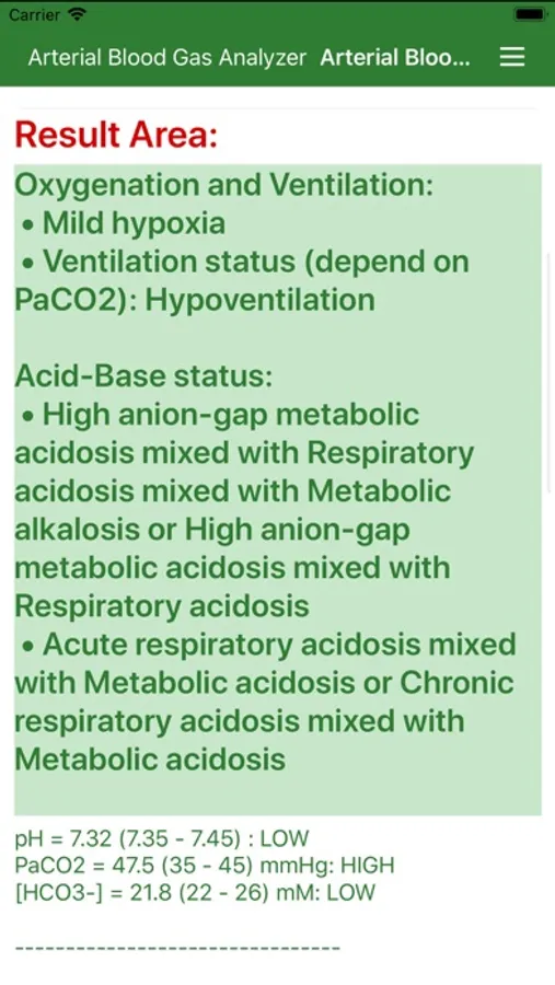The Arterial Blood Gas Analyzer (Pro) is the mobile application that helps to interpret the result of arterial blood gas. Its function are comparing the result with normal range, showing the A-a gradient, calculating the compensatory degree, and explaining the interpreted results. Moreover, the application user can set the custom normal ranges, the cut-off values, and the compensation equation.