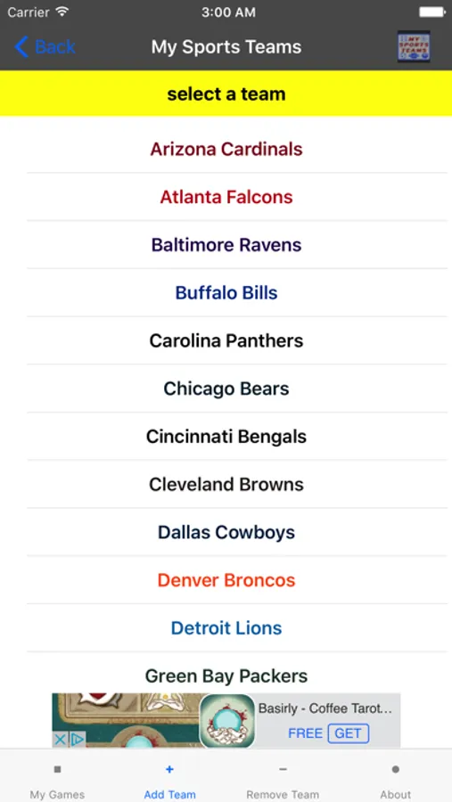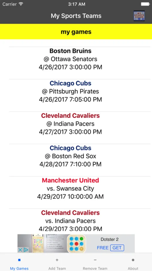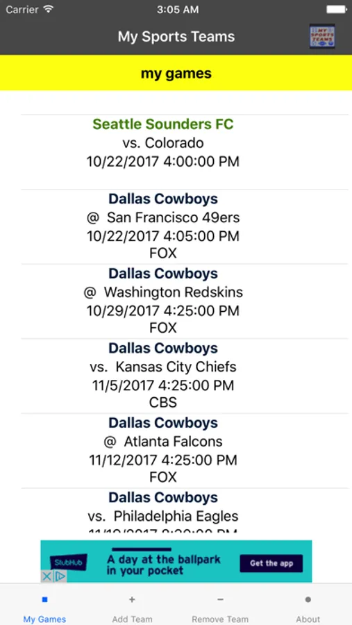 Upcoming game schedules for all your favorite pro sports teams in one place. The app currently supports football, baseball, hockey, basketball and soccer from the following leagues: