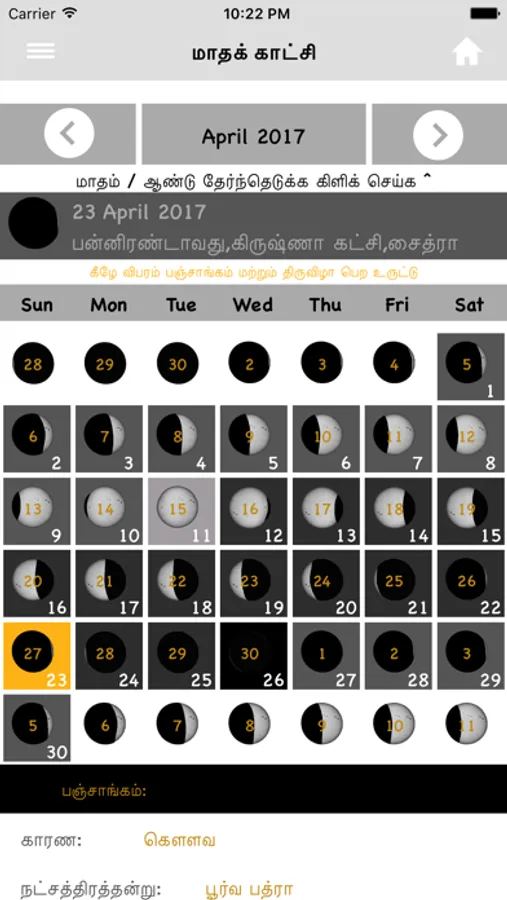 • Panchang for any day of the calendar. Tithi, paksha (shukla and krishna), yoga, karana, nakshatra and vaar.