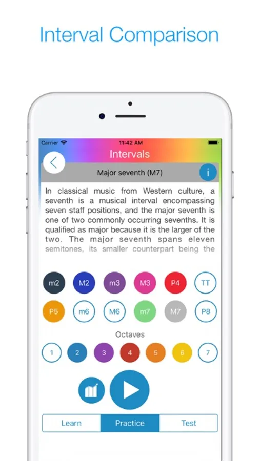• Learn: random practice in the selected interval / chord and octaves (the result is shown on a virtual piano)