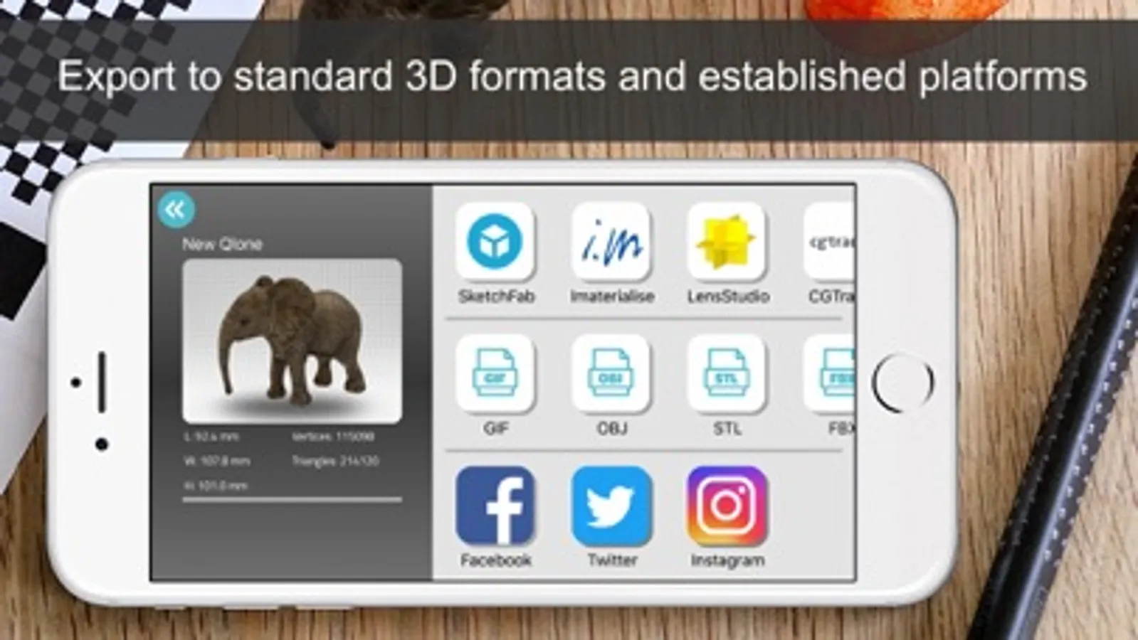Export your model directly to platforms like SketchFab, i.materialise, Lens Studio, Shapeways and CGTrader. Models can be exported in a variety of formats for use in other 3D tools – OBJ, STL, FBX, USDZ, GLB (Binary glTF) which includes animation, PLY, X3D.
