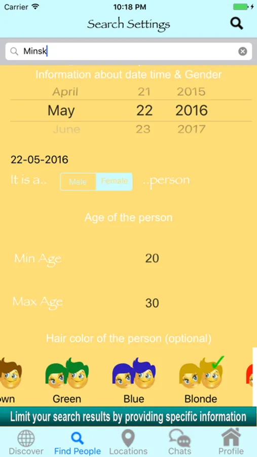 To filter your search results more precisely you are also able to provide some optional information like eye color or bodyheight.