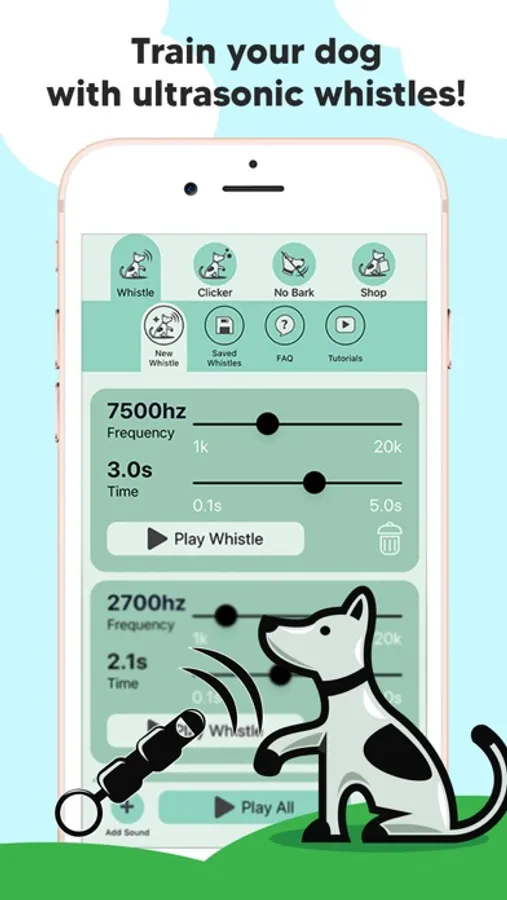 CREATE YOUR OWN WHISTLES – Create your own whistle by adjusting the frequency and time. You can create a one-sound whistle or combine many sounds in one whistle. You can also play it anytime to hear how it sounds.