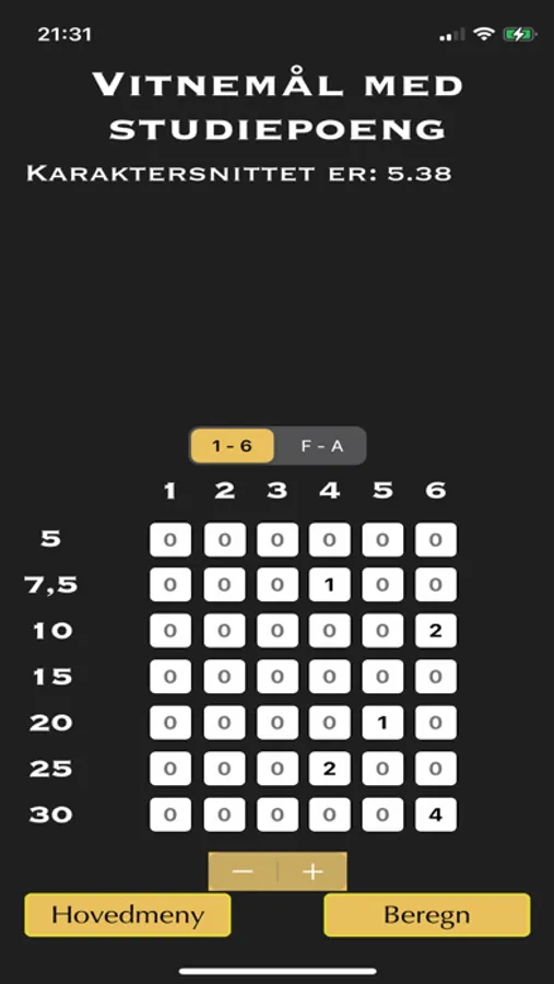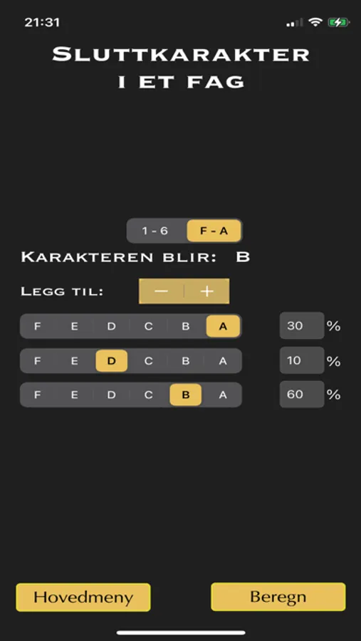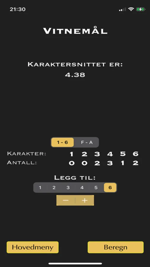 Beregn karaktersnittet ditt enkelt og raskt. Velg karakterer fra 1 til 6 eller F til A: