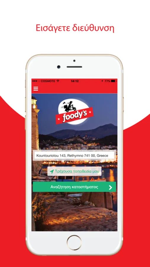 Το Foodys έχει την δυνατότητα να εντοπίσει αυτόματα την διεύθυνση που βρίσκεσαι. Εναλλακτικά μπορείς να εισάγεις χειροκίνητα την διεύθυνση & να ξεκινήσεις