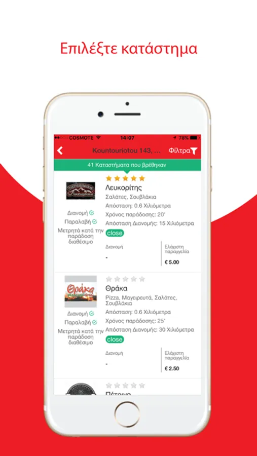 Αναζήτησε βάσει επιχείρησης, βάσει κουζίνας (Μαγειρευτά, Ιταλική, Μεξικάνικη, Grill κ.α.) ή βάσει είδους & βρες αυτό που σου αρέσει. Διάλεξε αν επιθυμείς διανομή στο χώρο σου (delivery) ή παραλαβή από το κατάστημα (pick up).