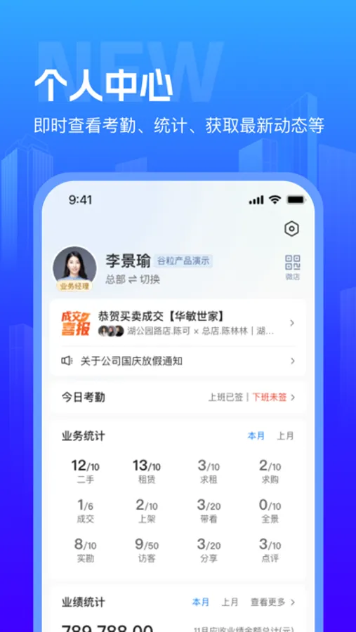 所有操作一键搞定,工作生活两不误,大大提高员工的工作效率,开启经纪人移动办公新时代!