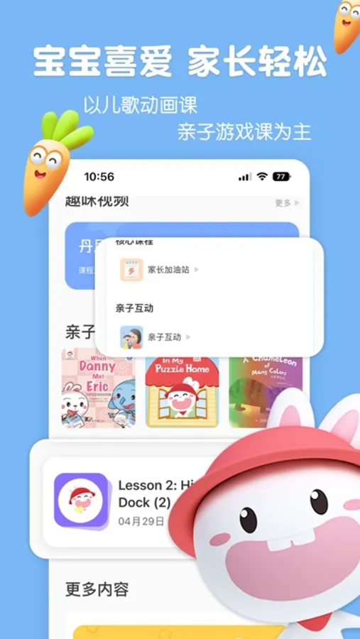 【海量资源】各种海量原创优质资源免费用。上百集在线优质BBC热门英语动画节目,搭配原创亲子英语游戏,纯正英文儿歌童话故事、以及丰富的英语单词卡、英文绘本、英语故事给孩子磨耳朵,加上专为宝贝设计的线下绘本教具产品,全方位打造幼儿英语学习系统。