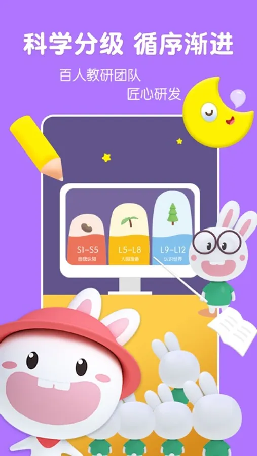 【精品课程】课程内容设计按照0-8岁年龄段特点,精细划分成12个等级,120个单元,根据儿童英语学习发展规律,课程难度循序渐进,抓住孩子英语早教启蒙的好时机!
