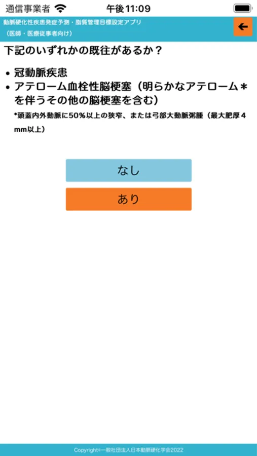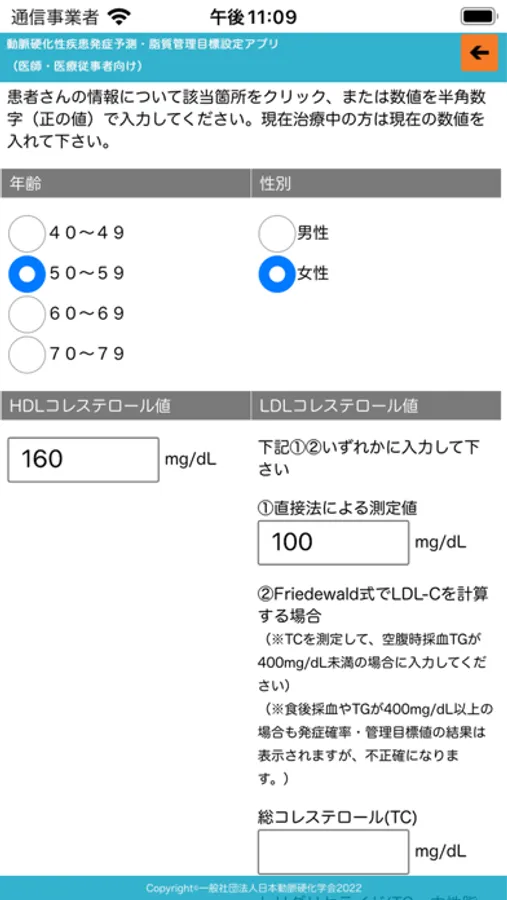 ・本アプリは日本動脈硬化学会 動脈硬化性疾患予防ガイドライン2022年版で用いられている動脈硬化性疾患(冠動脈疾患およびアテローム血栓性脳梗塞)の10年以内の発症確率に基づく脂質管理目標設定アプリです。