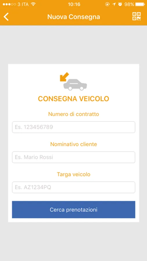 √ Consegna Veicolo: dopo aver ricercato la prenotazione tramite nominativo, mezzo, numero di contratto oppure codice a barre, l’app permette l’inserimento di data, ora e luogo di consegna, operatore che ha consegnato il mezzo con i km e il serbatoio alla consegna, possibilità di firma elettronica da far effettuare al cliente, aggiunta foto, possibilità di inviare il contratto in formato PDF per email al cliente.