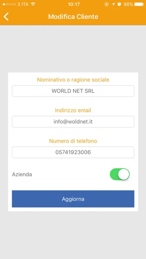√ Anagrafica Clienti: possibilità di inserire o modificare clienti direttamente dall’applicazione, con inserimento di Ragione Sociale, Email, Telefono e specifica se si tratta di privato o azienda.