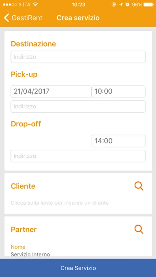 √ Inserimento di un nuovo servizio: data ora e luogo pick-up, ora e luogo drop-off, destinazione, cliente associato al servizio, specifica se si tratta di un servizio interno oppure passato ad un partner, autista e mezzo associati, eventuali note e stato del servizio (richiesta oppure confermato).