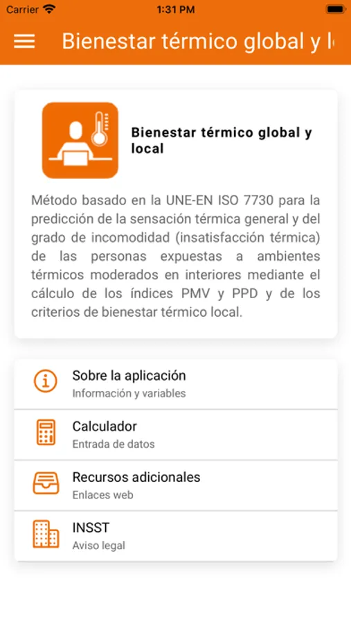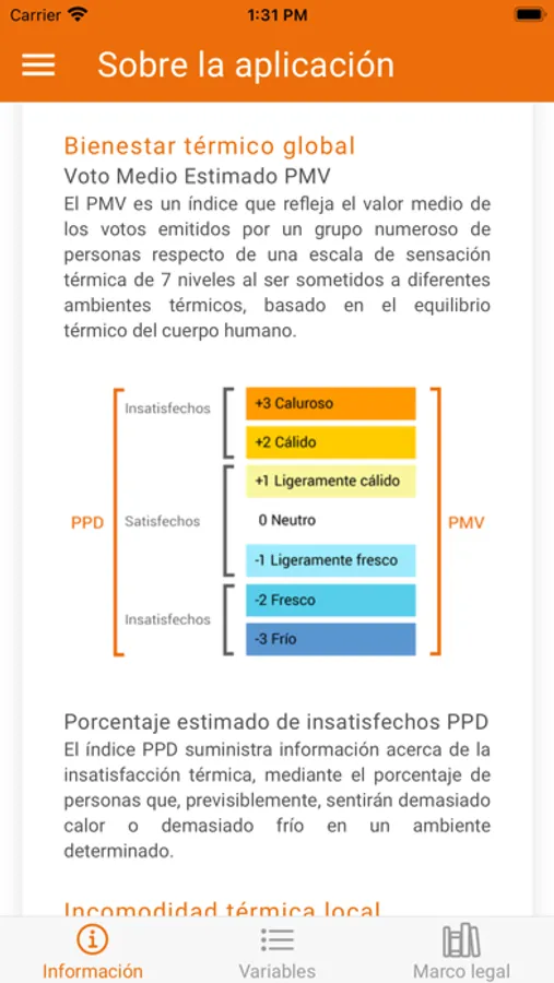 Esta aplicación, basada en la UNE-EN ISO 7730 “Determinación analítica e interpretación del bienestar térmico mediante el cálculo de los índices PMV y PPD y los criterios de bienestar térmico local”, permite calcular el bienestar térmico para el conjunto del cuerpo mediante los índices PMV (del inglés: predicted mean vote) y PPD (del inglés: predicted percentage dissatisfied), así como la incomodidad térmica local, mediante la determinación de los índices de insatisfechos debidos a: corrientes de aire, la diferencia vertical de la temperatura del aire, suelos calientes y fríos o la asimetría de temperatura radiante.