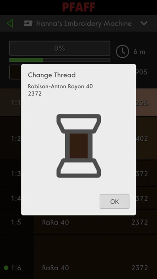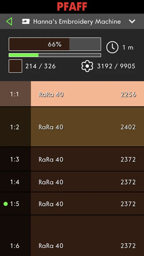 The app displays information about current stitch and time to next stop. It will notify you when the machine has stopped, for example when you need to change threads or when the amount of bobbin thread is low.