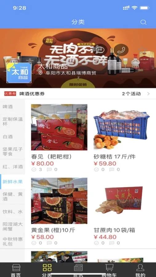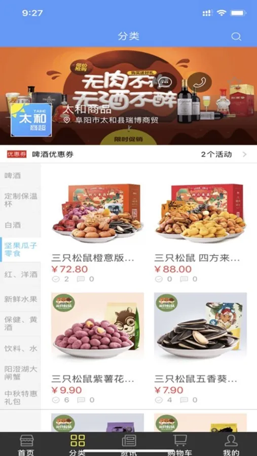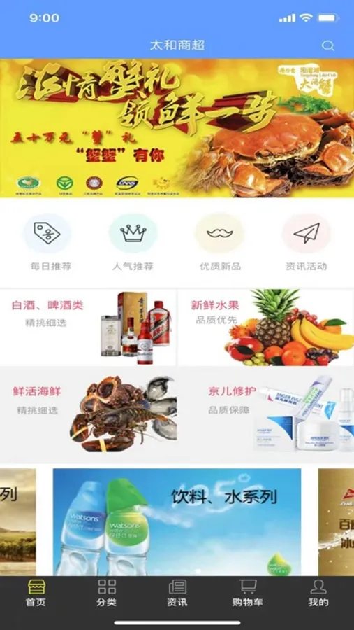本商超主营白酒类、啤酒类、红酒类、饮料、水类、茶业类、大闸蟹等产品。