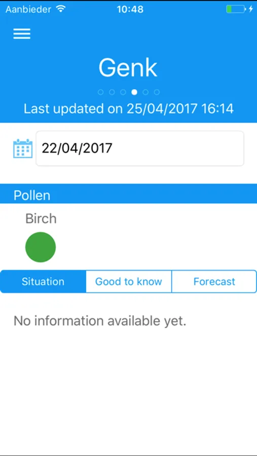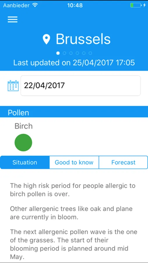 The main target users of Airallergy are allergic people and physicists. This application allows them to get an official confirmation of the presence of these allergens in the air and their concentrations, in order to adapt the diagnosis and/or the treatment prescription. The network includes five stations spread over the country. They are located in Brussels, De Haan, Genk, Marche-en-Famenne and Tournai. Brussels station’s data are updated every working day. These collected in the four satellite stations of the network are updated once a week, usually on Tuesday. The pollen concentrations are monitored from January to the end of September, whereas fungal spore concentrations are monitored until the end of November.