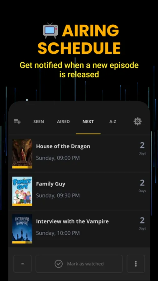 - Find out what's airing next on your watchlist