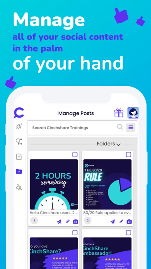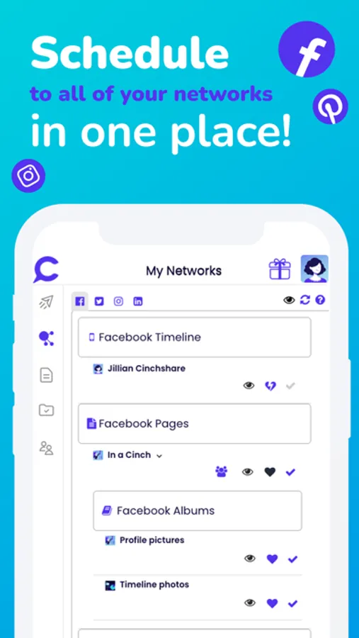 CinchShare is a super user friendly software that was created to help direct sellers save time and have a hassle free workflow when it comes to social media marketing. You do the planning and let us execute and deliver your posts to Facebook, Instagram, Twitter, Pinterest and LinkedIn. Plan now. Play later. We've got your back!