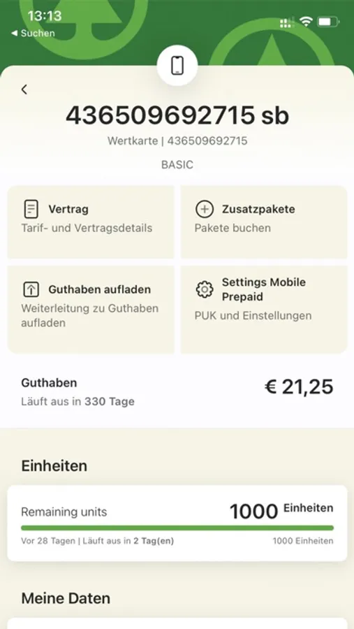 Sehen Sie ganz einfach, wie viel Datenvolumen oder wie viele Freieinheiten Ihnen noch zur Verfügung steht. Außerdem können Sie ihr Guthaben kontrollieren und bequem aufladen.