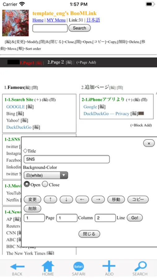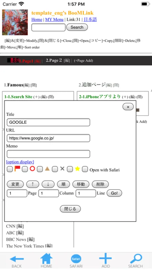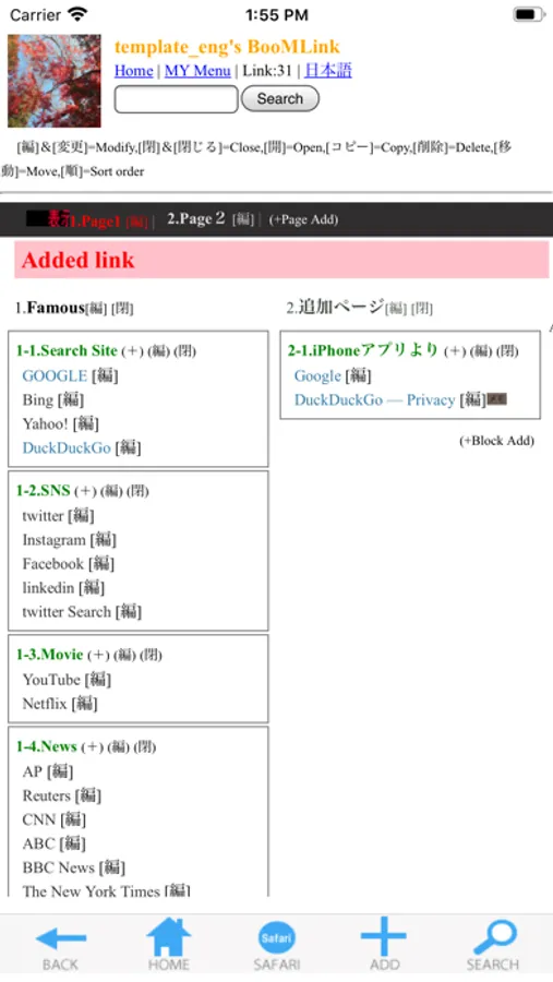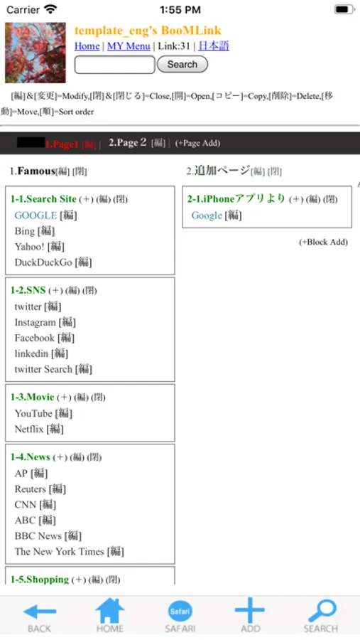 (+) .... Add button, the URL currently displayed is added to BooMLink as a bookmark with one click. (The link will be added to the "iPhoneアプリより" row in the "Save to: 追加ページ" column.) It is recommended to use the search button to display the website you want to add and then press this add button. It is easy to move, rearrange, and edit categories after addition, so let's add more and sort!