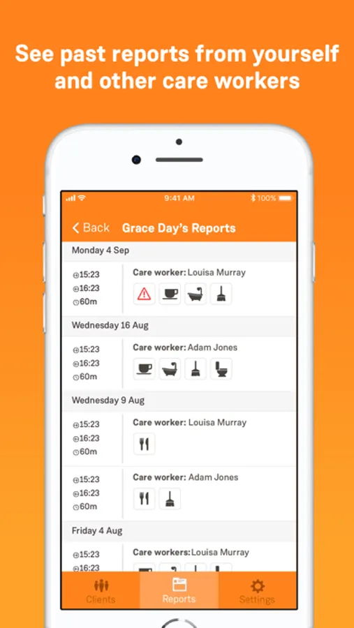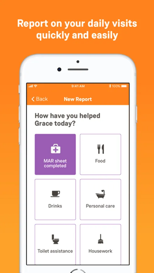 No need to check times and dates, or think what to write for each visit. With OnCare you can check in, select the activities you helped with, leave notes when necessary, and check out again, all in just a few taps.