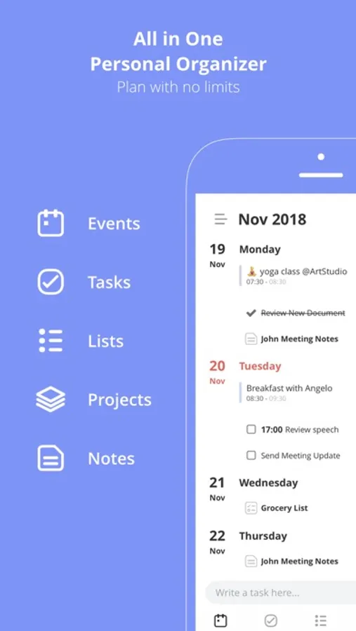 The first app combining calendar, note-taking and task management: your all in one personal organizer.