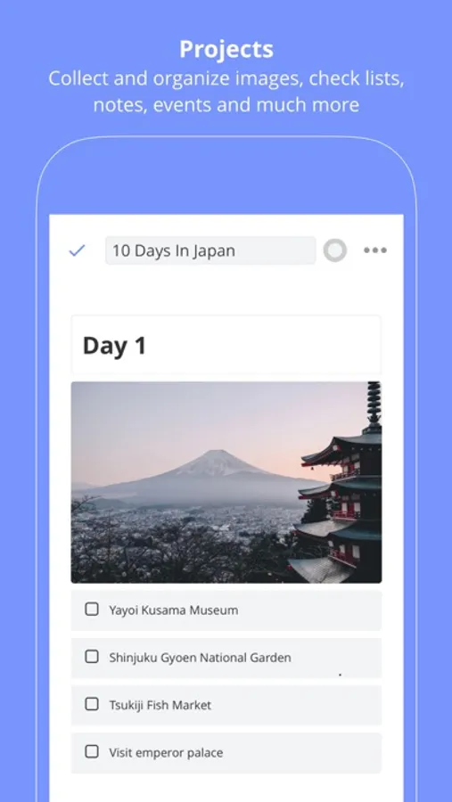 A project named "Trip to Japan" could collect things to do, places to visit, scheduled activities, tickets, reservations codes, directions, maps, thoughts and photos, links, all in one place.