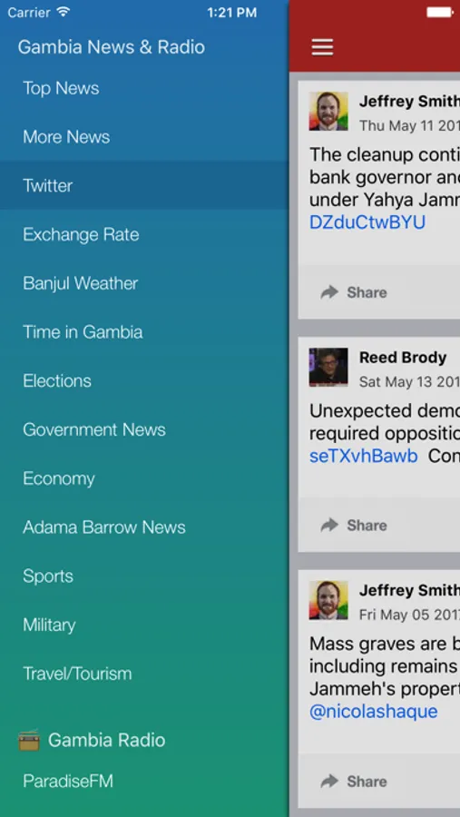 Latest Gambia News & Radio instantly at your fingertips, with notifications support! Get the breaking Gambia News including updates on the economy, military, president Barrow, travel/tourism, foreign relations with Senegal, Russia, China, EU & much more. Individual news sections dedicated to cities Banjul, Serekunda, Brikama, Bakau & Farafenni will keep you informed about local news happenings there. Enjoy streaming Gambia radio stations that include news/talk & music.