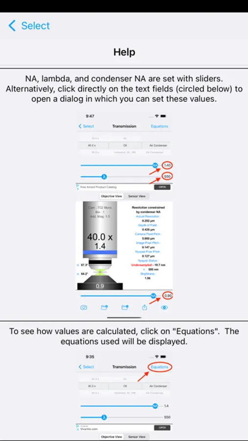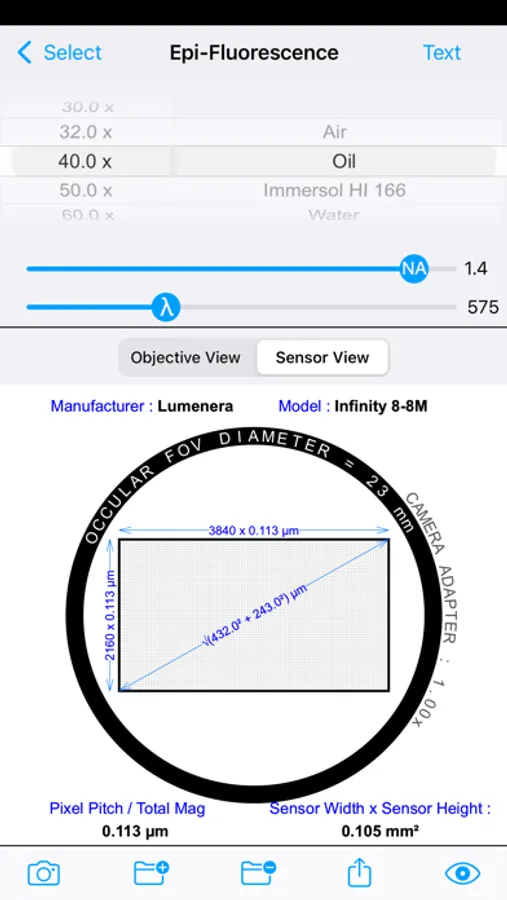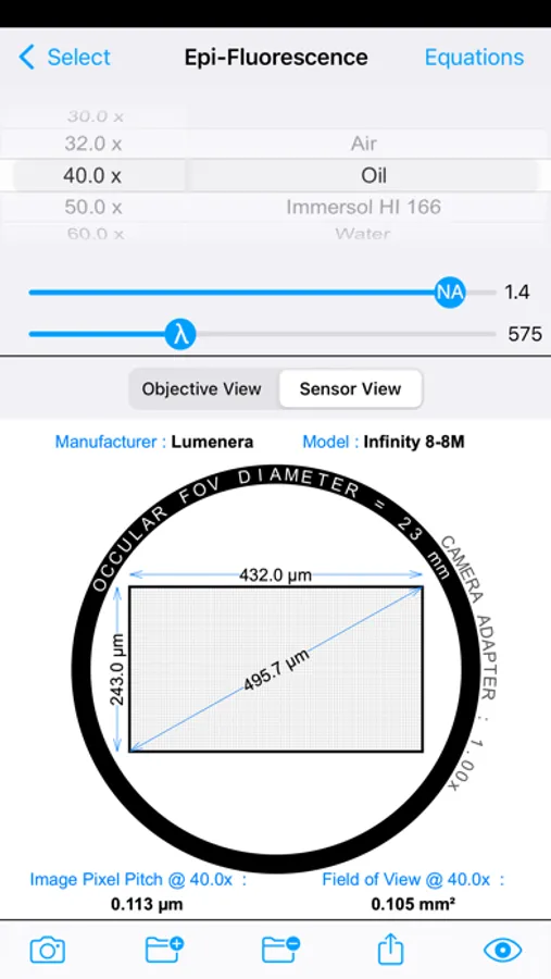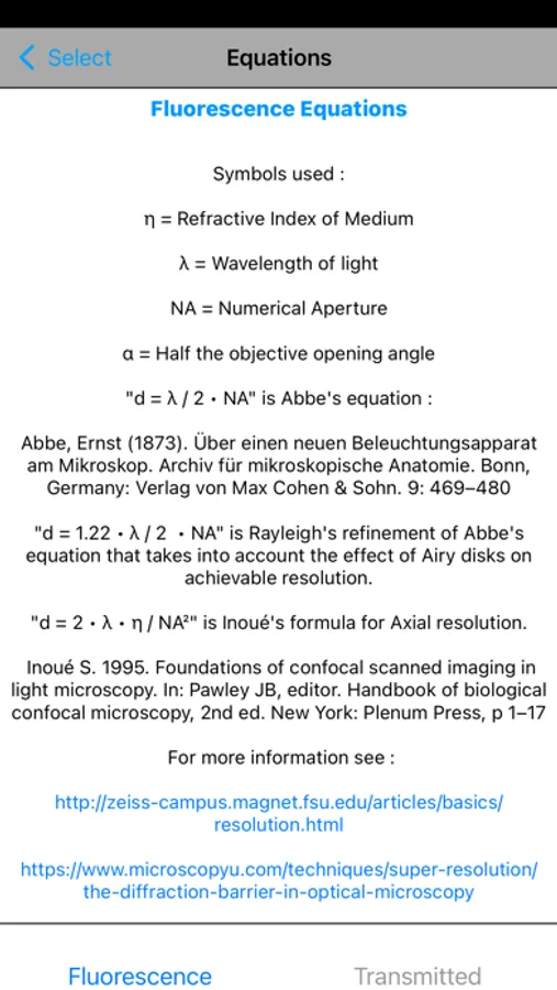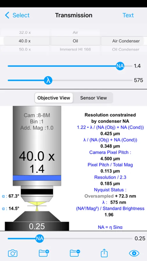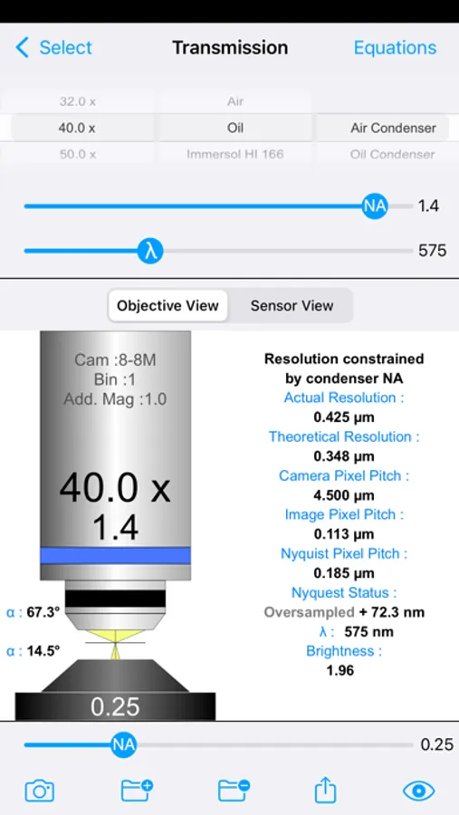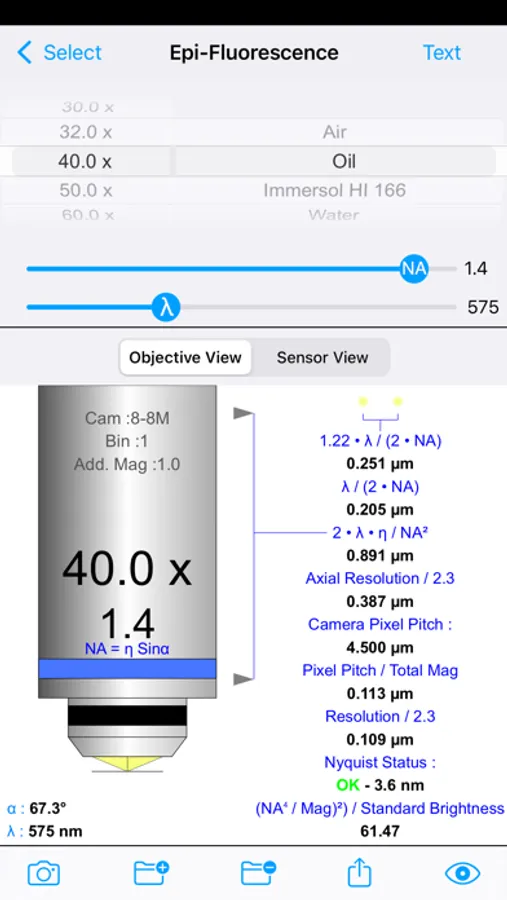 Characterize your microscope objective lenses, see how well matched they are to your microscope's image acquisition system. The App supports both transmitted light objectives and fluorescence objectives. Input the magnification, immersion medium (air, oil, glycerol or silicone oil), NA (numerical aperture), condenser NA and wavelength of light (lambda), to calculate the lateral resolution, axial resolution and brightness of the objective. Characterize your acquisition system (camera pixel size, camera binning and additional magnification) to check if you're sampling at Nyquist frequency. Each of your objectives can be saved and easily restored, and shared with other microscopists via e-mail, MMS, Linked-In or even Facebook. The equations used for the calculations can be displayed. The sources of equations are referenced in the "Information" section.