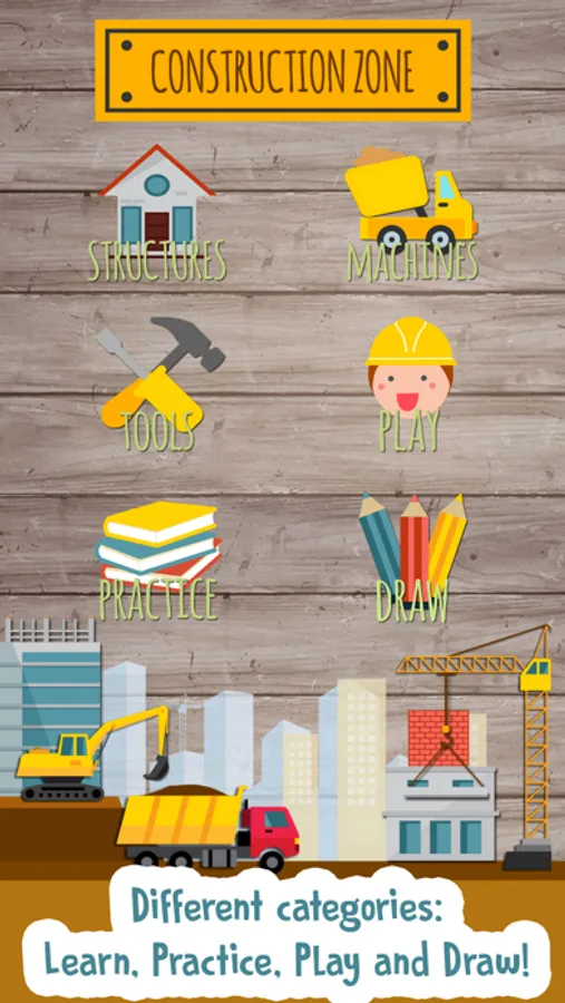 - There are 3 kids construction flashcard categories (structures, machines, tools)