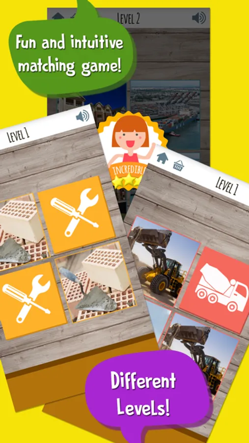 - Memory Matching Game: Kids will make brain exercise by playing memory matching game with structures, construction machines and tools.